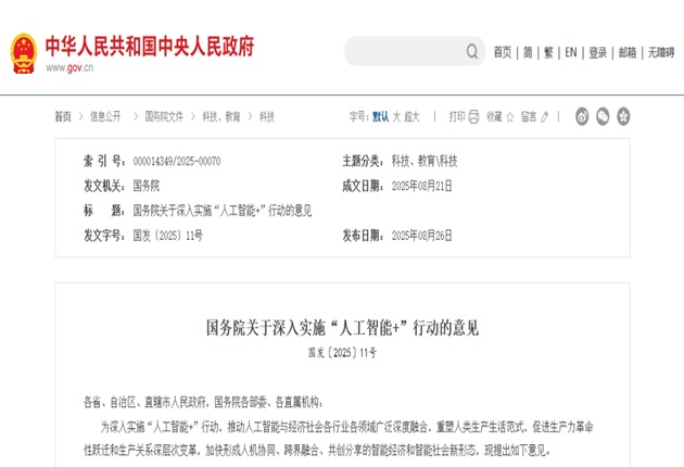 《国务院关于深入实施“人工智能+”行动的意见》。中国政府网截图